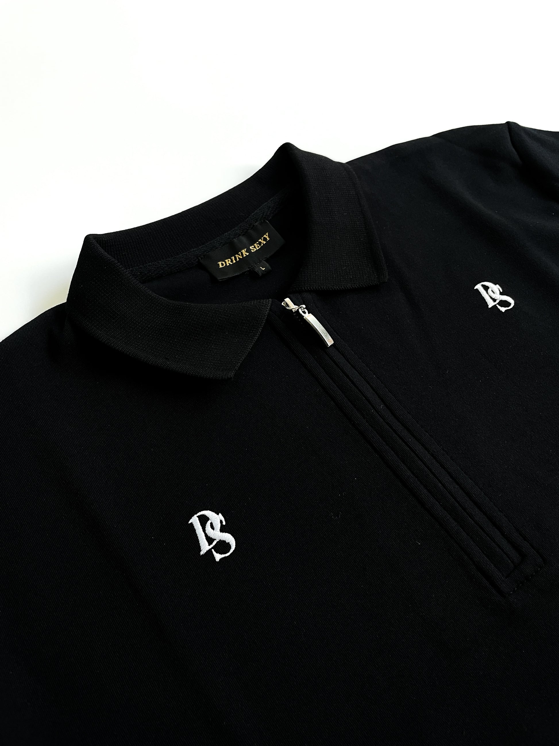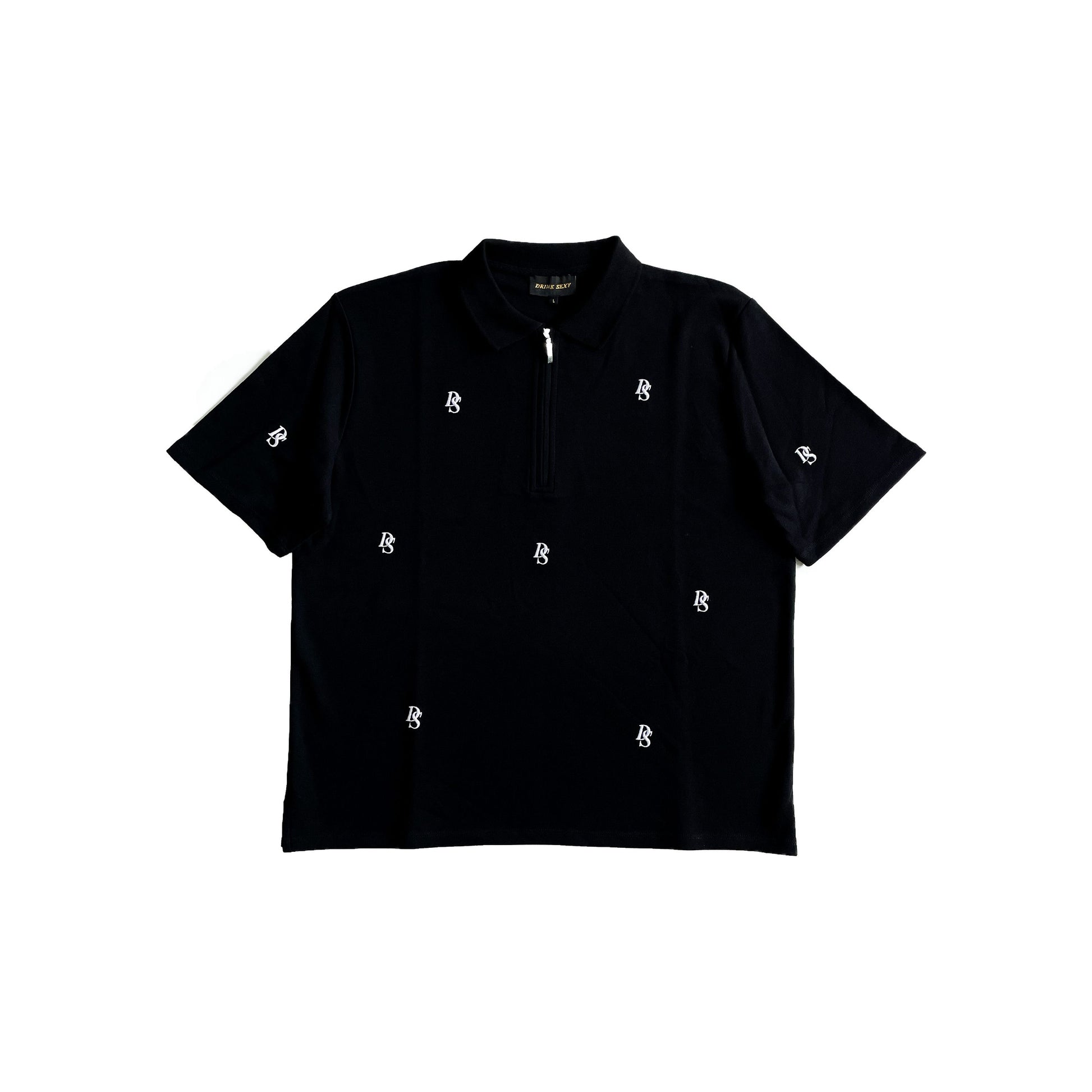 Black Polo With an Overall White DS Embroidery Pattern